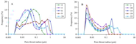 The mercury intrusion and extrusion curves for several typical samples obtained from the HPMI analysis are shown in Figure 6. The displacement pressures (Pd) of the samples containing pore-lining chlorite were relatively low, ranging from 0.469 MPa to 2.740 MPa. Their mercury intrusion saturations (Sm) were relatively high, ranging from 85.454% to 95.99%. Their median saturation pressures (P50) were relatively low, ranging from 11.149 MPa to 27.681 MPa. The samples without pore-lining chlorite had relatively high pressures (Pd), ranging from 0.674 MPa to 5.51 MPa. Their mercury intrusion saturations (Sm) were relatively low, ranging from 70.264% to 96.38%. The median saturation pressures (P50) were relatively high, ranging from 35.827 MPa to 113.454 MPa (Figure 6) (Table 2). The pore throat radius distributions of the samples containing pore-lining chlorite were uniform, and the peak value of the pore throat radii was greater than 0.01 μm (Figure 7A). The pore throat radius distributions of the samples without pore-lining chlorite were relatively concentrated, exhibiting a bimodal shape, and the pore throat radius was small, mainly concentrated below 0.01 μm (Figure 7B).