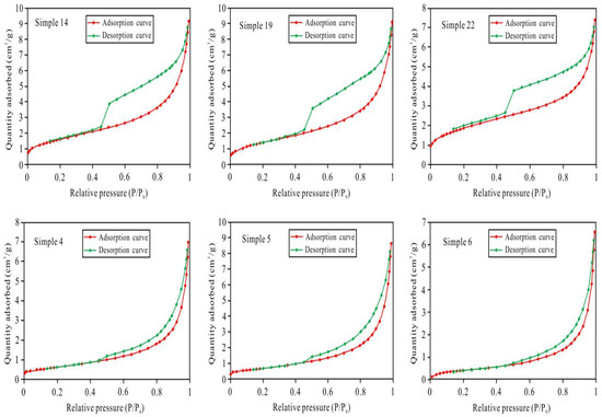 The LTNA analysis was carried out on a total of 14 samples for this study. An Autosorb-iQ specific surface area and pore-size distribution analyzer (Quantachrome, USA, Atlanta, GA, USA) was used for the LTNA analyses. The pore-size distribution range of this instrument is 1.7–300 nm, and a specific surface area as low as 0.0005 m2/g can be measured. In order to eliminate the residual bound water and capillary water in the samples, before the LTNA analyses, all of the samples were pretreated in a high-temperature vacuum at 300 °C for 3 h. Then, high-purity N2 (>99.999%) was used as the adsorbate, and the N2 adsorption capacities of the samples under different relative pressures were measured at a temperature of 77 K. The National Standard of the People’s Republic of China (GB/T19587-2004) was used as the reference for the analytical procedures [27].