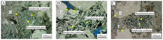 Pore-lining chlorite and andesite rock fragments internally dissolved pores. (A) Well Bei 210, 3949.97 m, plane-polarized light. (B) Well Bei 202, 3112.75 m, plane-polarized light. (C) Well Bei 210, 3949.5 m, plane-polarized light. Ch—Chlorite; Q—Quartz.