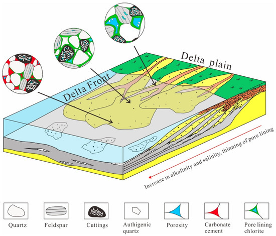 Relationship between authigenic chlorite and sedimentary environment (modified from [24]). The entrance of the lake is a high-energy, open, weakly alkaline reducing environment. The iron in the river flocculates due to the difference in salinity at the entrance of the lake. Under strong hydrodynamic conditions, clay minerals adhere to the surfaces of the particles to form pore-lining chlorite. As the water depth increases, the alkalinity and reducibility increase, the hydrodynamic conditions weaken, the pore-lining chlorite becomes thinner, and the carbonate cement precipitates from the pore fluid.