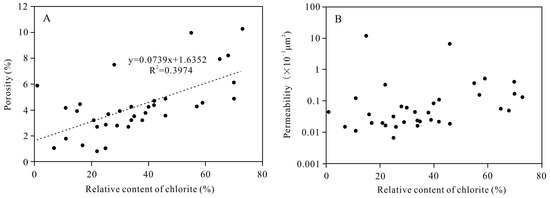 Relationship between relative content of chlorite and (A) porosity and (B) permeability.