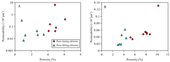 Relationship between porosity and permeability of chlorite in different occurrences: (A) well Bei 210 and (B) well Bei 202.