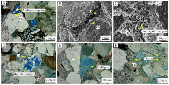 Before the beginning of diagenesis, the intergranular pores were mainly primary pores. As diagenesis progressed, when the fluid environment was an open, weakly alkaline reducing environment, a large amount of pore-lining chlorite developed with a good continuity, and the primary pores were surrounded by the pore-lining chlorite (Figure 13A and Figure 14B). In middle diagenetic stage A, the organic acids introduced by the oil and gas filling gradually changed the fluid environment from weakly alkaline to weakly acidic, and authigenic quartz began to form. The presence of the pore-lining chlorite inhibited the pressure dissolution between the quartz grains and reduced the SiO2 content of the pore fluid [20]. In addition, because the pore-lining chlorite surrounded the quartz grains and occupied the crystalline quartz basement [8], quartz overgrowth was suppressed. The quartz overgrowth phenomenon was basically not observed under the microscope. The quartz usually existed as authigenic crystals within the intergranular pores (Figure 13B and Figure 14C).
