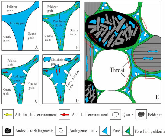 Influence of pore-lining chlorite on pore structure of tight clastic rock reservoir. (A) In the initial deposition stage, primary intergranular pores developed. (B) In the early diagenesis period, under weakly alkaline conditions, the pore-lining chlorite developed. (C) During the mid-diagenesis period, authigenic microcrystalline quartz gradually formed under acidic conditions. (D) The acidic fluid contacts the feldspar particles through the chlorite intercrystalline pores and then forms intragranular dissolved pores. (E) When the pore-lining chlorite is developed, the pore structure appears as large pores and narrow throats.