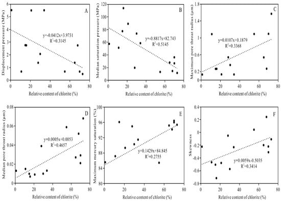 Relationship between the relative content of chlorite and (A) Displacement pressure, (B) Median saturation pressure, (C) Maximum pore throat radius, (D) Median pore throat radius, (E) Maximum mercury saturation, and (F) Skewness.