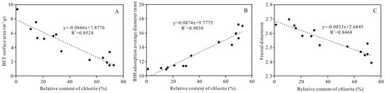 Relationship between the relative content of chlorite and (A) BET surface area, (B) BJH adsorption pore average diameter, and (C) fractal dimension.