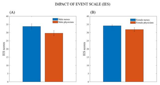 Mean (and SE) of Impact of Event Scale (IES) total score in male nurses (n = 45) and physicians (n = 28) and (A) Mean (and SE) of Impact of Event Scale (IES) total score in female nurses (n = 167) and physicians (n = 47) (B).