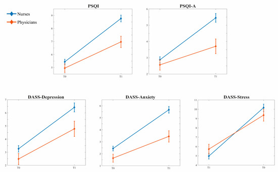 Specifically, subsequent ANOVAs on each dependent variable (Table 2 and Figure 2) revealed that—independently from the time interval—nurses showed worse conditions on all examined dimensions (PSQI, PSQI-A, DASS-Depression, DASS-Anxiety), except for DASS-Stress. In addition, both groups reported higher scores (i.e., worsening) on all sleep and psychological scales during the current phase than before the pandemic. However, the “Time” vs. “Profession” interaction points to a greater pandemic-related worsening in nurses compared with physicians on PSQI, PSQI-A, DASS-Anxiety, and DASS-Stress scores.