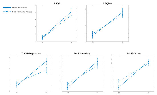 Mean (and SE) across the two time periods (T0: before the pandemic; T1: current period) among frontline (n = 80) and non-frontline (n = 132) nurses working for the following variables: total scores of Pittsburgh Sleep Quality Index (PSQI), total scores Pittsburgh Sleep Quality Index-Addendum (PSQI-A), scores on each scale of Depression Anxiety Stress Scale (DASS-21).