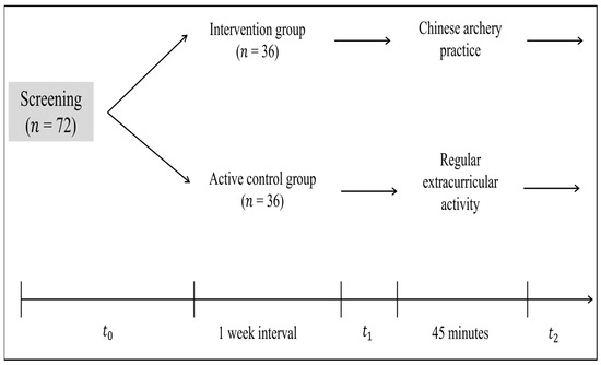 The study incorporates three sessions with different periods (Figure 1). Firstly, during the screening session (t0), demographic data were collected. Using a between-subjects pretest posttest comparison design, all eligible subjects were assigned to receive either intervention group or active control group. Secondly, all subjects completed the core EFs performance assessment as pretest (t1) before treatment. Thirdly, after a 45-min treatment period, posttest (t2) was conducted in both groups. Core EFs performance assessment includes inhibition control, working memory, and cognitive flexibility. Subjects in the intervention group performed Chinese archery practice. The subjects in the active control group performed regular extracurricular activities.