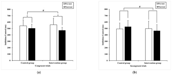 The performance of inhibition control within and between subjects. (a) the mean difference in reaction time of congruent trials; (b) the mean difference in reaction time of incongruent trials. Note, * present p < 0.05, within subjects and # present p < 0.05, between subjects, respectively. The data are presented as the mean ± SD.