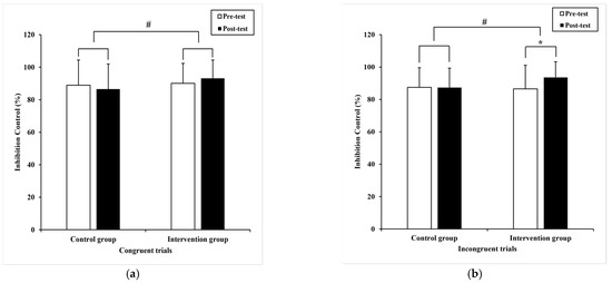 The performance of inhibition control within and between subjects. (a) the mean difference in accuracy of congruent trials; (b) the mean difference in accuracy of incongruent trials. Note, * present p < 0.05, within subjects and # present p < 0.05, between subjects, respectively. The data are presented as the mean ± SD.