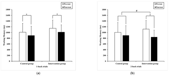 Furthermore, a significant difference (t = 2.18, p = 0.04) showed in 1-back trials in the control group, pre-test (1010.47 ± 308.65) milliseconds compared to post-test (899.33 ± 319.07) milliseconds (Figure 4a). In contrast, the difference failed to reach significance in 2-back trials (t = 1.92, p = 0.06).