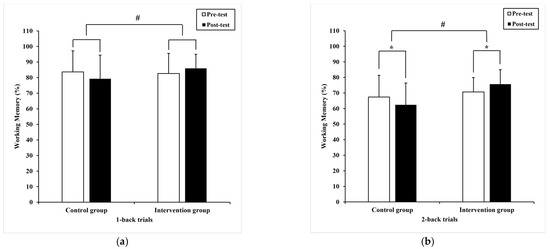 Regarding accuracy, the Paired-samples T-test demonstrated a significant improvement (−5.06 ± 13.81), (95% CI: −9.73–−0.38) in the 2-back trials (t = −2.20 p = 0.04), with pre-test (70.7 ± 9.2)% compared to post-test (75.7 ± 9.3)% in the intervention group (Figure 5b), although it did not reach significance in 1-back trials (t = −1.93, p = 0.06). Moreover, a significant decline was displayed in 2-back trials (t = 2.23, p = 0.03) with pre-test (67.3 ± 11.4)% compared to post-test (62.4 ± 14.0)% in the control group (Figure 5b).