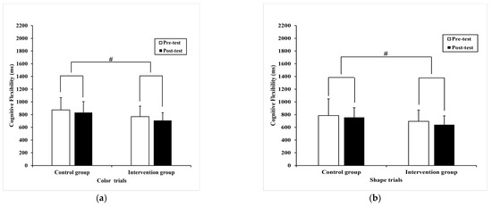 The performance of cognitive flexibility within and between subjects. (a) the mean difference in reaction time of color trials; (b) the mean difference in reaction time of shape trials. Note, # present p < 0.05, between subjects, respectively. The data are presented as the mean ± SD.