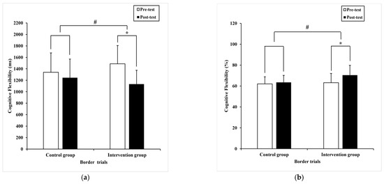 The performance of cognitive flexibility within and between subjects. (a) the mean difference in reaction time of border trials; (b) the mean difference in accuracy of border trials. Note, * present p < 0.05, within subjects and # present p < 0.05, between subjects, respectively. The data are presented as the mean ± SD.