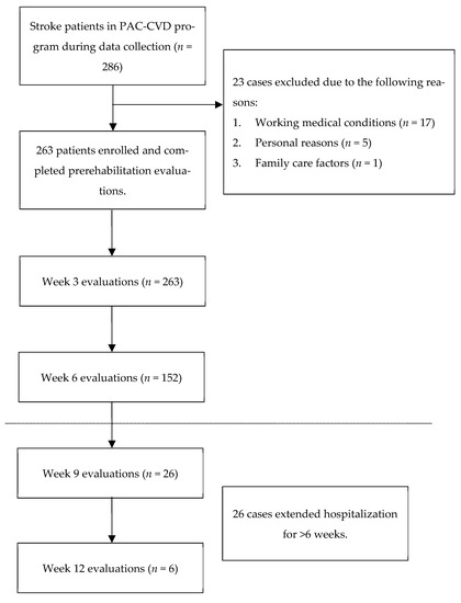 - Tung, Y.J.; Huang, C.T.; Lin, W.C.; Cheng, H.H.; Chow, J.C.; Ho, C.H.; Chou, W. Longer length of post-acute care stay causes greater functional improvements in poststroke patients. Medicine 2021, 100, e26564. [Google Scholar] [CrossRef]