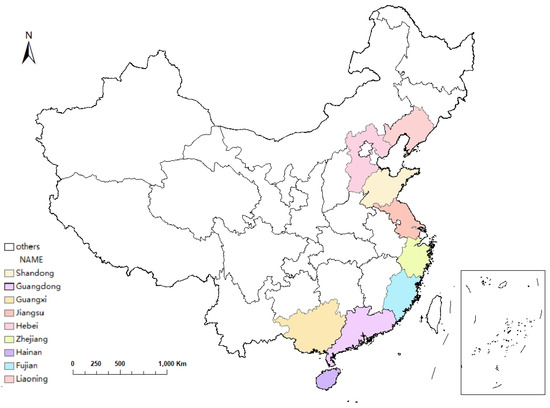 Marine fisheries are one of the representative industries with high energy consumption in the marine economy. Therefore, in this paper, when estimating the carbon emissions of marine fisheries in the nine coastal provinces of China (see Figure 1), the calculation is mainly based on the operating mode power of marine fishing vessels. The estimation of marine carbon sink is mainly calculated using the output of marine shellfish aquaculture. China’s marine aquaculture can be divided into fish, shellfish, crustaceans (shrimp, crab), algae, seafood, etc. More than 95% of the output in the research of fishery carbon sinks has been invested in the production process, and fish and crustaceans do not belong to the category of fishery carbon sinks [26,27,28]. Therefore, this study defines marine aquaculture carbon sinks as shellfish and algae carbon sinks. China’s marine cultured shellfish and algae consists mainly of clams, oysters, scallops, mussels, kelp, seaweed, wakame, and gracilaria, and the rest were classified into other categories for calculation. The data on the operation mode of fishing boats, the data on the production of shellfish and algae in marine aquaculture, and the data on the economic output value of oceanic fisheries are all from the “China Fishery Statistical Yearbook” (2009–2019).