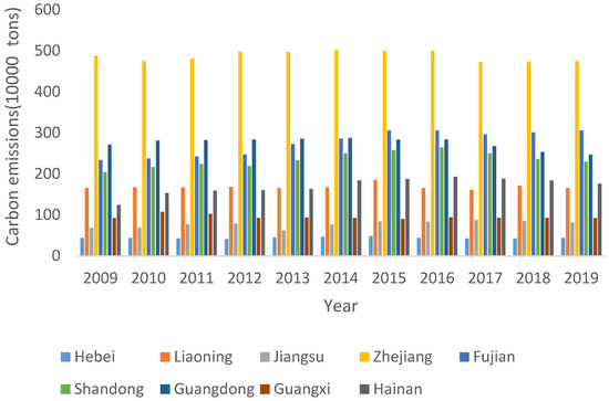Net carbon emissions of marine fisheries in nine coastal provinces from 2009 to 2019 (10,000 tons).