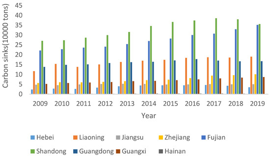 Carbon sinks of marine fisheries in nine coastal provinces from 2009 to 2019 year (10,000 tons).
