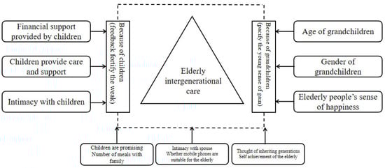 From the perspective of generations, the lower the income, health level, and education level of offspring, the easier it is to receive the support of parental intergenerational care. At the same time, the financial support provided by offspring will increase the amount of time devoted to parental intergenerational care, as studied by Jin, W.L. (1986) [7]. Intergenerational care embodies the exchange of economic support and care between generations. At the same time, it enhances the intimacy with grandchildren so as to further enhance the feedback of children’s old-age support, it also promotes intergenerational care for parents, as studied by Zhong, Z.B. et al., (2015) [8]. During the process of grandchildren’s birth to their upbringing, the intergenerational focus of family structure also naturally shifts from the father supported by the children to the grandchildren, becoming a new force for family development, as studied by Yan, Y. [9]. With the development of modernization, although the family structure tends to be smaller, the proportion of interaction between generations is on the rise. Raising grandchildren has become a business that needs to be completed by two generations of fathers and sons, as studied by Li, T. and H, W.B. (2018) [10]. The provision of intergenerational care for the elderly is a continuous manifestation of self-worth, which helps them to maintain more social contact and exercise behaviors, as studied by He, N. (2021) [11].