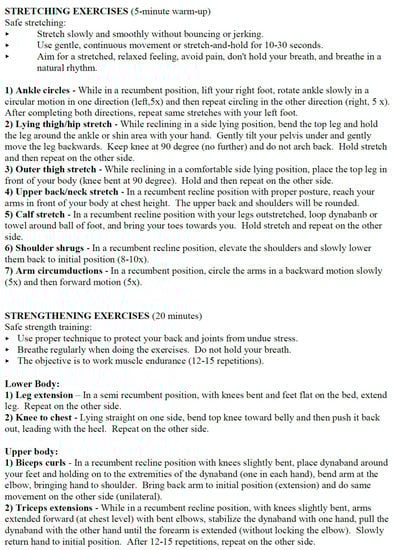 Regarding high-risk pregnant individuals who are activity-restricted, some studies have described exercises that may be performed for individuals on bed rest. First, the recommendation for bed rest should be re-considered: those at risk for preterm labor may be able to partake in an exercise program with negligible risk of increasing uterine activity [46]. An aquatic exercise program showed some benefits to hospitalized pregnant individuals [47]. If bed rest is finally prescribed, or mandatory because of the need for continuous maternal monitoring, a described bed-rest exercise program is shown to be safe for both the pregnant individual and the fetus, with no associated adverse outcomes or increasing uterine activity [48]. This consisted of a 30 min three-phase exercise program using resistance bands as a form of resistance exercise for both lower and upper body with 5 min stretching for a warm-up and cool-down phase, and 20 min of muscle strengthening exercises. See Figure 1 as an example of a bed-rest exercise program. These exercises can be modified to the needs of the pregnant individual. In addition, the frequency, intensity, duration, and type of exercise [49] used in a hospitalized bed-rest exercise program is important to consider. The program must be flexible to accommodate the constantly changing schedule of these patients due to the timing of medical tests throughout the day. However, as in any exercise program, it is important to keep the individual motivated and accountable for continuing the program while hospitalized and to also assist in maintaining the program once birth has occurred, in order to help with rehabilitation from activity restriction in the postpartum period.