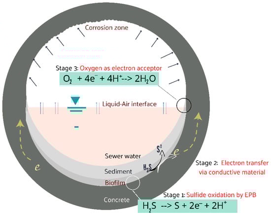 Therefore, in this study, the work plan assumed the oxidation of sulfide by electron-releasing bacteria, as shown in Figure 1. First, the H2S removal occurs in the anodic section of the conductive concrete surface of the biofilm layer, the EPB activity releases electrons accompanied by the H2S oxidation of the organic matter. Subsequently, the electrons transfer to the electron acceptors through the electronic pathway inside the conductive concrete. Finally, at the liquid–air interface, oxygen, as an electron acceptor, reacts to produce water.