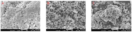 Scanning electron microscopy (SEM) images of the prepared conductive materials: (A) San-earth M5C, (B) Denka Black, and (C) Magnetite MTB-30.