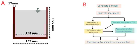 All experiments were performed at room temperature (24 °C ± 0.1) using distilled water (SA-2100A; A type, Tokyo Rika Kikai Co., Ltd., Tokyo, Japan). The reagents used were of special grade obtained from Kishida Chemical Co., Ltd., Nacalai Tesque Co., Ltd., Osaka, Japan and FUJIFILM Wako Chemicals Industries, Ltd., Tokyo, Japan. The materials used as conductive concrete (Figure 2) and their basic properties are described below.