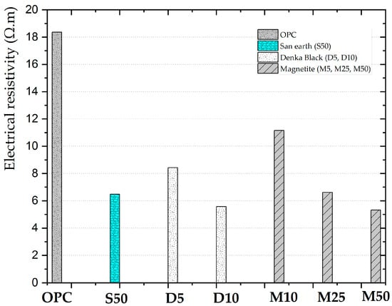 The results obtained from the preliminary measurements of the electrical resistivity of various conductive concretes are presented in Figure 4. OPC has the strongest resistance to the flow of electrons, having the electrical resistivity of approximately 18 Ω·m. A negative correlation was found between the amounts of Denka Black and Magnetite MTB-30, in the total powder and electrical resistivity. Increasing the weight ratio of the conductive substances in concrete resulted in a lower electrical resistivity. Denka Black has a resistivity of more than 8.4 Ω·m with a content of 5 wt.% (D5) and was reduced to approximately 5.6 Ω·m at a weight content of 10% (D10). From the magnetite results, three samples were collected, magnetite was added gradually at 5% (M5), 25% (M25), and 50% (M50) weight content, and the electrical resistivity decreased from more than 11 Ω·m to 6.6 and 5.3 Ω·m, respectively. An individual sample of San-earth had a 50 wt.% (S50) stated outcome of nearly 6.5 Ω·m, whereas that of Denka Black was only 10 wt.% (D10).