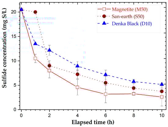 In the sulfide adsorption experiments, the most conductive materials, Denka Black (D10), San-earth (S50), and magnetite (M50), were chosen for the H2S adsorption experiment. The equilibrium was achieved after approximately 8 h.