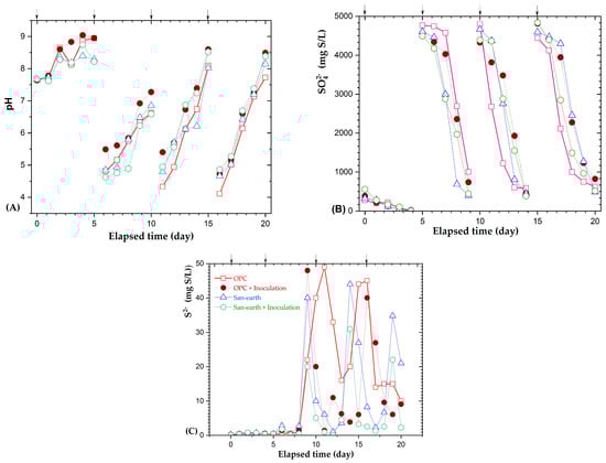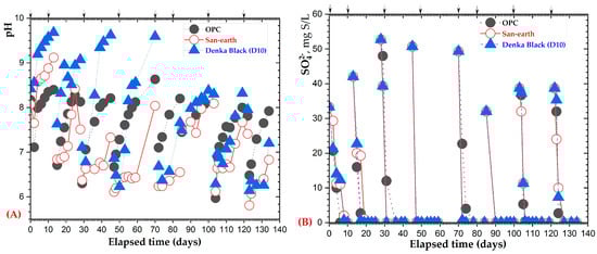 Sulfide reduction experiments using concrete: OPC, San-earth, and Denka Black. The arrows indicate the addition of glucose and magnesium sulfate. (A) pH, (B) sulfate, and (C) sulfide concentrations. Arrow (↓) indicates the addition of glucose and magnesium sulfate.