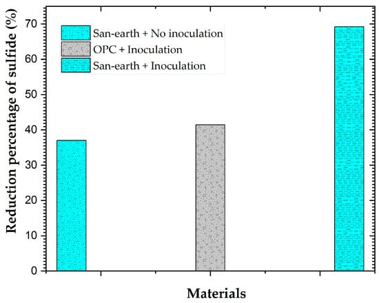 To evaluate this effect quantitatively and more intuitively, the average sulfide concentration over the 20-day experimental period was calculated, and the reduction percentages of sulfide in the EPB strains inoculated with OPC and San-earth with and without the inoculation of EPB were compared, as shown in Figure 7. San-earth with the EPB inoculation had the highest percentage of the H2S reduction (69%), whereas OPC with the inoculation and Sun-earth without the inoculation had percentages of 41% and 37%, respectively.