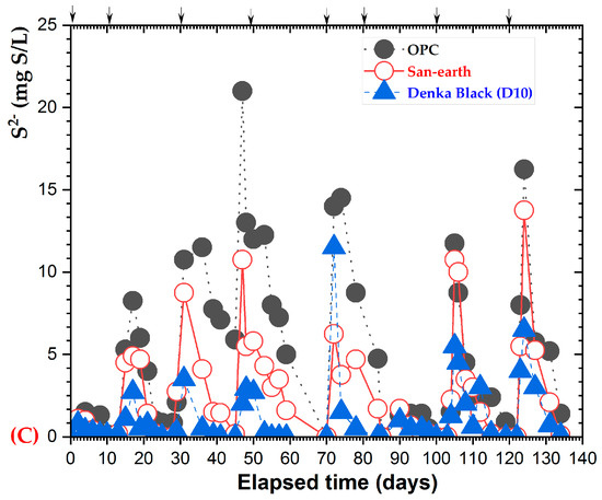 The results obtained from monitoring the pH, sulfate, and sulfide concentrations for 134 days are presented in Figure 8. The progress of the pH and sulfate ions over time followed the same trend, as that shown in Figure 6. The sulfide change (Figure 8C) from the data comparison of OPC and San-earth, demonstrates that the new conductive concrete, Denka black (D10), was the most effective in reducing H2S, and a representative example is shown.