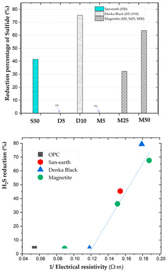 Previous findings failed to provide a clear explanation of the adsorption capacity and biological oxidation, particularly regarding the H2S inhibition [24]. Moreover, the adsorption capacity of the new conductive concretes for the H2S reduction (Figure 5) is concerning. These materials are representative of the most conductive substances with conductivities (Figure 4): M50 > D10 > S50. Magnetite (M50) and Denka Black (D10) were found to be more effective for absorbing H2S than the commercial San-earth. However, no evidence was found that the adsorption capacity of M50 was more effective in the H2S reduction, as illustrated in Figure 9. Accordingly, a sample of D10 with a Denka Black content of 10 wt.% had a significant H2S reduction (approximately 75%), suggesting that the adsorption of a material does not contribute to the main mechanism for eliminating H2S, even though its capacity is reduced for the sulfide reduction.