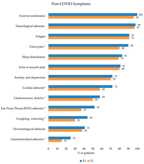 All participants showed ongoing symptoms related to post-COVID at T1. Figure 1 illustrates 13 summarized symptom clusters, while a detailed recording of symptoms is presented in Figure S1 in the Supplementary Materials. All patients indicated having symptoms of exercise intolerance, 98% suffered from neurological ailments, 91% from fatigue, and 91% from chest pain. As seen in Figure 1, there was a decrease in the prevalence of all symptoms at T2 except for fatigue.