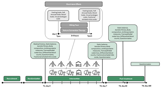 Secondary parameters were nature connectedness (Connectedness to Nature Scale (CNS), Nature Relatedness Scale (NRS) and Inclusion to Nature Scale (INS)), sociopsychological well-being in the sense of flourishing of personality (Flourishing Scale (FS-D), life satisfaction (Satisfaction with Life Scale (SWLS), health-related control beliefs (FEGK), subjective impairments of the participants Mindfulness (Mindful Attention and Awareness Scale (MAAS). Measurements of the International Physical Activity Questionnaire Short Form (IPAQ-SF) were collected at T1, T3 and T4 to assess a possible long-term impact of the intervention on the subjects’ physical activity behavior. Additionally, the following physiological parameters were collected on T1, T2 and T3: static balance (MFT-S3 Check), body composition via Bio Impedance Analysis (Four-terminal impedance analyzer), differential blood count (Forearm venous blood), fractional exhaled nitric oxide (FeNO; NioxMino®), aerobic fitness (Chester step test) and transepithelial water loss (TEPWL, Tewameter® TM 300). Additionally, anthropometric measures (height, weight, waist and hip circumference) were acquired. The motion profile of the heart rate monitors (watches on the wrists of the subjects) was obtained over the time of the intervention.