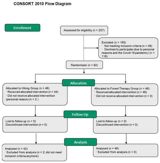 In October 2019, 24 people were enrolled in the HG and 28 in the FTG; in June 2021, 20 people were enrolled in the HG and 18 in the FTG. This time gap occurred due to limited scientific staff resources. The four groups were pooled into one HG (n = 42) and one FTG (n = 46) for examination. Two participants from the HG did not receive allocated intervention (personal reasons) and two further participants were excluded from the analysis because they did not meet inclusion criteria anymore (relationship status). Consequently, 42 participants of the HG and 46 participants of the forest therapy group (Figure 2) were included for the intention-to-treat-analysis.