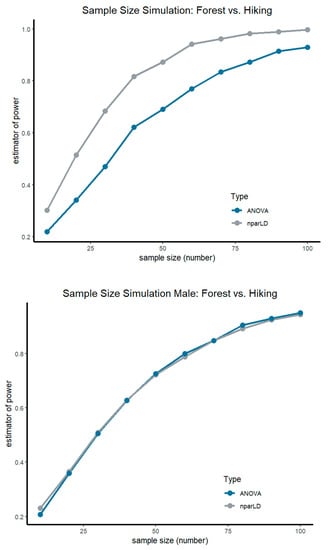 Consistent with the bootstrap sample size simulation for the primary outcome SF12 Total Score, a sample size of at least n = 50 per group is needed to achieve a power of 1−β = 0.87 in the case nparLD analysis for the comparison of the two interventions, mountain hiking and forest therapy. A larger sample size is required for analysis using ANOVA−at least n = 80 per group is required to achieve a power of 1−β = 0.87 (see Figure 4). The gender-specific comparison between the Mountain HG and the FTG in terms of aerobic capacity reveals the following results: Females require at least an n of 70 (1−β = 0.85) in a nparLD analysis, whereas males require an n of at least 80 (1−β = 0.89). With respect to an ANOVA analysis, women (1−β = 0.89), similarly to men (1−β = 0.91), need an n of at least 80.