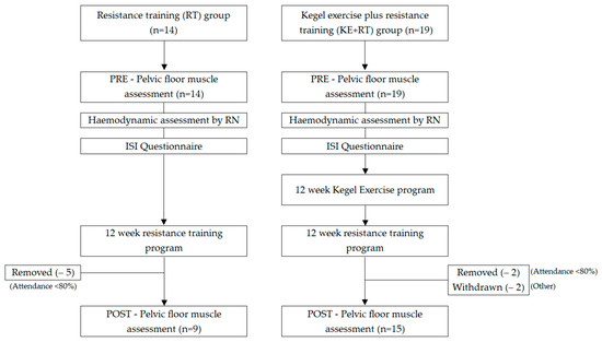 Both the RT group and KE + RT group were recruited following identical recruitment procedures started with an expression of interest to flyers advertising the project in local shopping centers, social media and around a university campus. All participants in this study met the criteria of being female, over eighteen years of age, experience SUI, did not perform Kegel exercises, had no experience in regular resistance/training, and were not currently pregnant or breastfeeding for the duration of the study. All participants were informed about the conditions of the program including the requirement for a pelvic floor assessment, an outline of the RT program and the commitment required of 12 weeks including at least 80% attendance at the training session. A self-screening tool “physical activity readiness questionnaire (PAR-Q)” was required to rule out participants not suitable for physical exercise. They were also informed they could withdraw from the study at any point. Written consent was received from all participants.