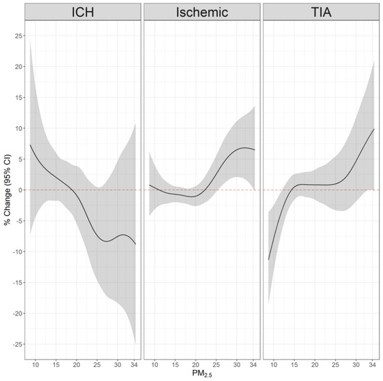 Regarding ICH, we initially observed a protective effect while using a linear term. However, as supported by the nonlinear exposure–response curve, there was no association with ICH and the protective effect could be attributed to larger errors in this smaller groups. The lack of association with ICH can be due to the lower occurrence of this type of stroke, or due to a different pathology. Similar to our findings, a recent meta-analysis concluded that the majority of studies evaluated did not find a significant association between ICH and short-term air pollution exposure [3]. A nonsignificant negative relationship between PM2.5 and ICH was observed in some studies which they attributed to the differences in the pathology of ICH and ischemic stroke [5,8,9].