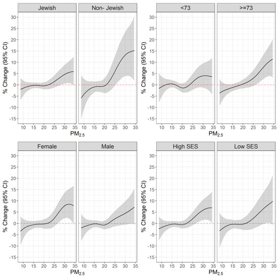 For example, the percent increases in ischemic stroke/TIA risks (95% CI) associated with a 1 µg/m3 increase in PM2.5 exposure when the reference was set up at 30 µg/m3, were: 4.61% (0.63%; 8.74%) and 13.18% (3.90%; 23.30%), among Jewish vs. non-Jewish, 3.97% (−1.19%; 9.42%) and 7.92% (2.75%; 13.36%) among younger vs. older adults, and 4.44% (−0.52%; 9.65%) and 7.80% (2.40%; 13.50%) among men vs. women.