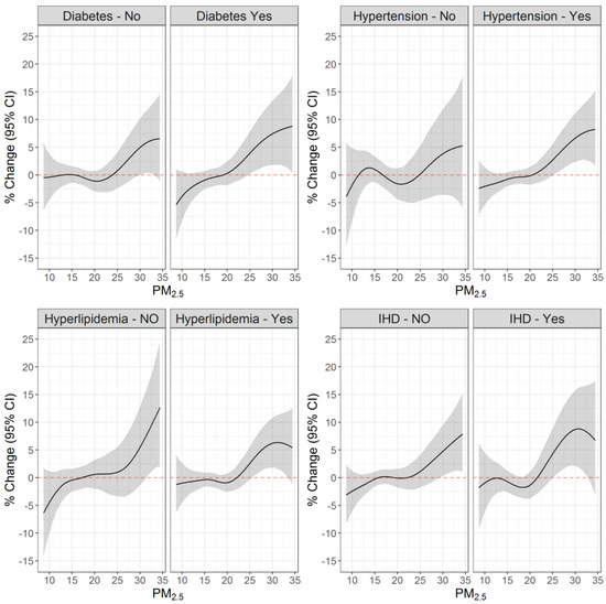 The PM2.5 and ischemic stroke/TIA associations were also larger among individuals with diabetes, hypertension, and ischemic heart disease, compared to those without the disease (Figure 3). For example, setting PM2.5 exposure at a 30 µg/m3 reference, we found 7.43% (1.86%; 13.30%) and 4.96% (0.09%; 10.06%) increased risks among people with and without diabetes, 6.65% (2.44%; 11.03%) and 3.81% (−3.52%; 11.70%) among people with and without hypertension, and 8.70% (2.17%; 15.66%) and 4.74% (0.35%; 9.33%) among people with and without IHD.