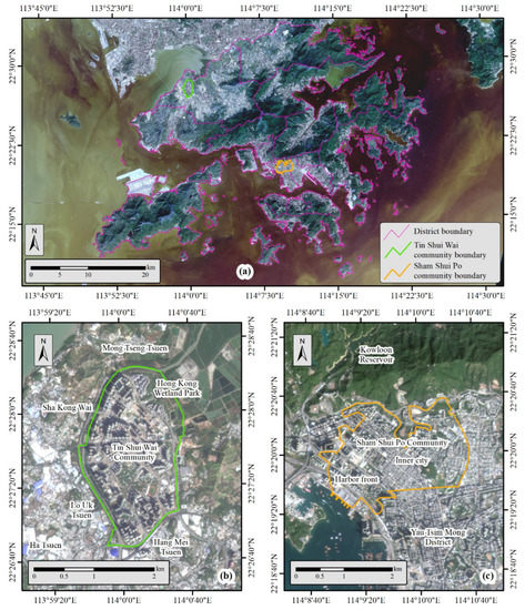 Communities in Hong Kong are mainly old towns developed in earlier times and new towns developed since the 1950s. Old towns and new towns represent two geographic contexts with considerable differences in building density, urban planning, traffic networks, etc. [31]. SSP is chosen to represent the old towns in Hong Kong. It is a densely populated community, and the blocks included in this study have a total area of 5.35 km2, with a residential population of about 300,000 in 2018. On the other hand, TSW is chosen to represent the new towns in Hong Kong. It has a total area of 4.32 km2 and its residential population was also about 300,000 in 2018. SSP and TSW can well represent the geographic contexts of old towns and new towns in Hong Kong (Figure 1b,c). SSP belongs to the downtown area of Hong Kong, which is among the earliest-developed urban areas and is well-urbanized [32]. The major part of SSP, namely the inner city, has mostly lower and crowded buildings that are directly adjacent to numerous narrow roads, making air exchange less efficient. TSW is a town newly developed in the 1980s in northwestern Hong Kong [32], and is adjacent to the Hong Kong Wetland Park and Hong Kong’s fish farm regions. The social facilities and infrastructures in TSW are well designed with better open space and the roads are located far from residential buildings with green spaces between them as barriers. The entire TSW community is enclosed by villages and natural parks.