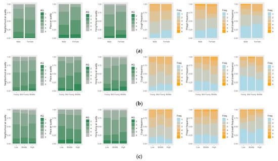 The overall association between people’s perceived air quality and their self-reported frequency of respiratory symptoms is first examined for all participants without considering the disparities between different socio-demographic groups and in different geographic contexts. The results indicate a weak but significant association between people’s perceived overall Hong Kong air quality (Hong Kong air quality) and the frequency they had phlegm (Table 4). No significant association is observed using other indicators. This association is consistent with current studies that people’s perceived poor air quality can represent their actual exposure to poor air conditions [21,22,24]. However, since different groups of people may have distinct vulnerabilities to poor air conditions, the same exposure to poor air conditions may not yield similar respiratory symptoms. For example, older adults may have a greater susceptibility to airway inflammation than younger adults when they are exposed to a similar level of traffic-related air pollution [38]. The aggregated statistics of different groups of people may yield insignificant results and hinder the identification of population groups with higher health risks. This may be the reason why the results in Table 4 show only one weak association and many insignificant associations between people’s perceived air quality and their self-reported frequency of respiratory symptoms, while many studies showed a strong significant association between people’s perceived air quality and their exposure to poor air conditions. Consequently, it is necessary to examine the disparities in these associations for different groups of people to explore these more vulnerable groups.