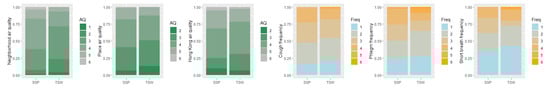 As indicated by the collected data, there is no significant disparity in perceived air quality between different socio-demographic groups (Figure 2) and geographic contexts (Figure 3) except for a few notable variables. Regarding people’s perceived air quality, male participants reported worse perceived place air quality than female participants, middle-young participants reported worse perceived place air quality than middle-aged participants, and SSP participants reported much worse perceived neighborhood air quality than TSW participants (Figure 2a,b and Figure 3, and Table 2). Previous studies indicate that women tend to more frequently report worse air quality than men in the same situation [26,27,28]. However, other studies have indicated that women may have a smaller activity space than men [35,36,37], whereby we cannot assume that women and men have visited the same places with the same air quality conditions regarding their perceived place air quality. Our results suggest that men may visit places with worse air quality than women, and the disparity is statistically significant (Table 2) even though female participants may tend to report worse air quality. The difference between middle-young and middle-aged participants may have a similar reason, whereby our observations indicate that middle-young participants may visit places with worse air quality than middle-aged participants. To our best knowledge, the disparity in the perceived air quality between the participants of different age groups is a novel observation. This disparity may be due to the age-related differences in the sensitivity to air pollutants, daily mobility, and work and activity contexts, which needs further exploration. The difference between SSP and TSW is mainly due to the geographic contexts. SSP is the downtown area of Hong Kong, with heavier traffic and more crowded buildings, and thus may concentrate more air pollutants from vehicle emissions and lead to poorer air quality. In contrast, TSW is in a new town with a better design of open space, surrounded by villages and natural parks, and thus may be less affected by air pollution. The difference between other socio-demographic groups is not statistically different from 0, and we can assume equivalent observations for correlation analysis.