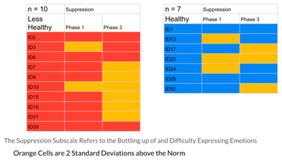 The results indicated that the healthier group had 23% of their responses in the problematic range, while the less healthy group had 40%. Figure 1, Figure 2, Figure 3, Figure 4 and Figure 5 display the contrast between the two groups (see Figure 1, Figure 2, Figure 3, Figure 4 and Figure 5). In particular, one can see stark differences in Phase 3 on the suppression and unprocessed emotions subscales. There is also a marked difference summed across the phases for the controllability of emotions. Finally, one can see a much greater awareness of their emotions in Phase 3 for the healthier group. As an additional quantitative analysis, Table 3 depicts the means and standard deviations on the EPS subscales, divided by the healthier and less healthy coping groups. Given the small n’s, we chose to conduct a sign test on the 10 mean comparisons. Nine of the 10 means for the less healthy coping group were higher than the means for the more healthy coping group, indicating greater difficulty in emotional processing, z = 2.53, p = 0.011 (see Table 3).
