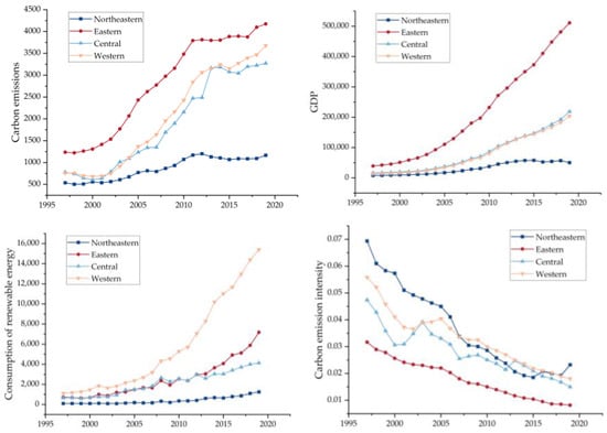 Figure 2. It can be seen that for carbon emission and GDP, all the four economic regions are on the rise. Compared with the overall trend, the economic growth of the eastern region is the fastest and the corresponding carbon emission is also higher, while the economic growth of the northeast region is slower than the other three regions. As for the consumption of renewable energy, all regions show an upward trend. With the change of time, the western region is better than the eastern, central and northeast regions, which is related to the rich hydropower and wind power resources in the western regions, such as Sichuan and other provinces, and the high proportion of renewable energy consumption, reflecting the differences in the energy structure among different regions. As for the carbon emission intensity, the four regions show a downward trend and are gradually approaching each other, which reflects that China’s carbon emissions per unit of economic growth are becoming less and less, and the differences between regions are also gradually decreasing, which is related to the technological progress brought about by economic growth.