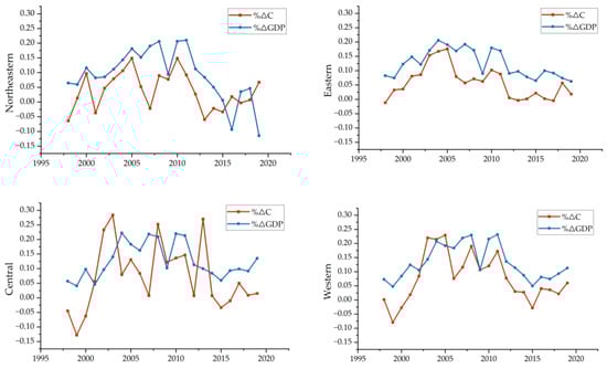 Figure 3, carbon emissions of the northeast region experienced negative growth in 1998, 2001, 2007, 2013–2015 and 2017, while the economic growth rate was positive from 1998 to 2015, but the GDP experienced a negative growth from 2016 to 2019. In general, changes in economic growth and carbon emissions are not yet stable enough and are highly fluctuating. As for the eastern region, which has more developed provinces, GDP has been maintaining positive, with rapid growth from 2004 to 2011, corresponding to the same period of carbon emissions, which are also in a high growth state. Both of growth rates have slowed down in recent years, and the growth rate of carbon emissions is always lower than the economic growth rate. As the central region with a high proportion of traditional energy consumption, the GDP has always maintained positive growth. For the western region, the GDP growth is always positive, but the overall growth rate is slower than that of the central region, and the growth rate of carbon emissions is slower than that of the economy, except for some years when it is faster than the GDP growth rate.