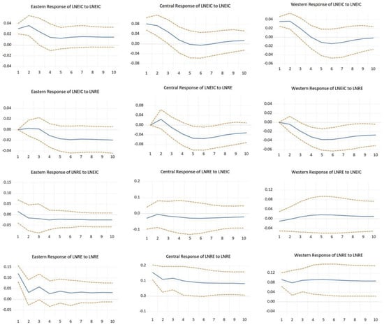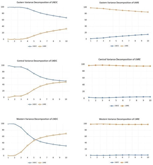 Figure 5. From the variance decomposition of LNRE in the eastern region, the contribution rate of LNRE itself slowly decreases from 98% at the beginning to 85%, while the contribution rate of LNEIC slowly increases from 2% at the beginning to 15%. It indicates that as the carbon emission intensity decreases, the endogenous promotion effect of renewable energy consumption gradually decreases, and the influence of carbon emission intensity on its consumption gradually increases. From the variance decomposition of LNEIC in the eastern region, the contribution rate of LNEIC itself tends to 100% in the first three periods, and the contribution rate of LNRE to it is basically equal to 0. From the fourth period onwards, the contribution rate of LNEIC itself gradually decreases, and the contribution rate of LBRE gradually increases to 33% in the tenth period, which indicates that as time goes by, the promotion effect of vigorous development of renewable energy on the reduction of carbon emission intensity becomes more obvious.